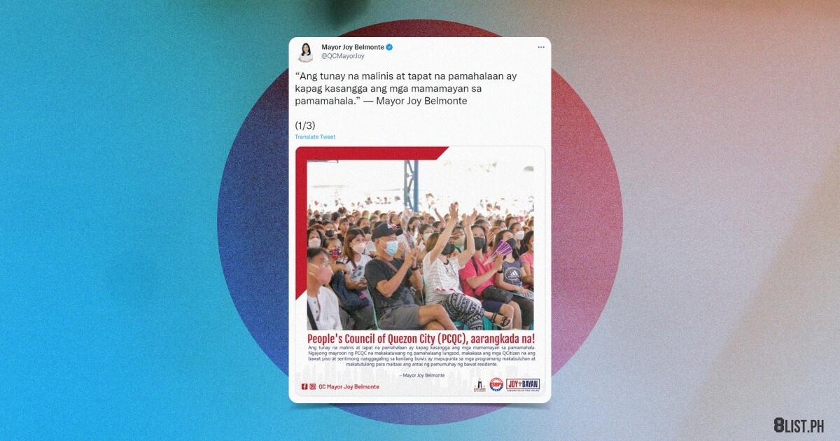 Since yesterday, “Mayor Joy” has been trending online, as netizens congratulate reelected Mayor Joy Belmonte for the initiation of the People’s Council of Quezon City (PCQC). After 13 long years, it was established in accordance with the Participation, Accountability, and Transparency (PAT) Ordinance, which “strengthens and institutionalizes the system of partnership of the local government and its constituents.”
