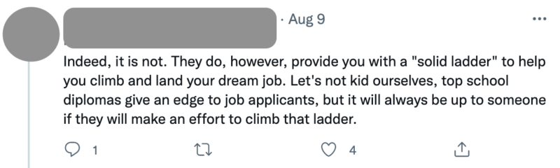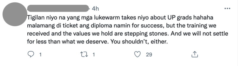 One reply to the original tweet summarized what everyone was fighting over: “Indeed, [a UP diploma is not a golden ticket]. They do, however, provide you with a ‘solid ladder’ to help you climb and land your dream job. Let’s not kid ourselves, top school diplomas give an edge to job applicants, but it will always be up to someone if they will make an effort to climb that ladder.”