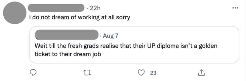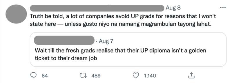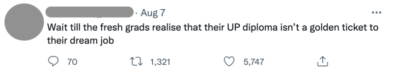 “Wait till the fresh grads realize that their UP diploma isn’t a golden ticket to their dream job,” read the controversial tweet posted last August 7. As of writing, it has amassed 5.7k likes and 1.3k retweets, most of which disagree with the original poster (OP).