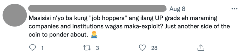 “Masisisi n’yo ba kung ‘job hoppers’ ang ilang UP grads eh maraming companies and institutions wagas maka-exploit? Just another side of the coin to ponder about,” tweeted one netizen.