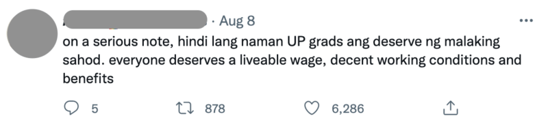 “On a serious note, hindi lang naman UP grads ang deserve ng malaking sahod. Everyone deserves a liveable wage, decent working conditions and benefits,” tweeted one netizen.