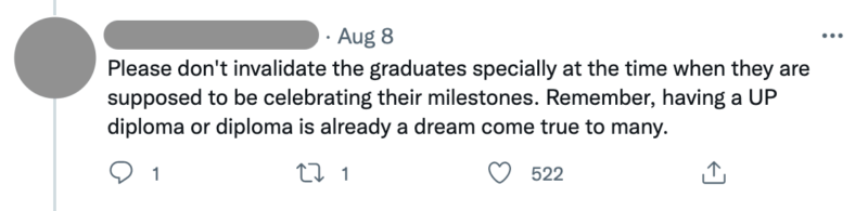 “Please don’t invalidate the graduates, especially at the time when they are supposed to be celebrating their milestones. Remember, having a UP diploma or diploma is already a dream come true for many,” replied one Twitter user. OP’s tweet came just a week after UP’s in-person graduation rites which upset people all the more.