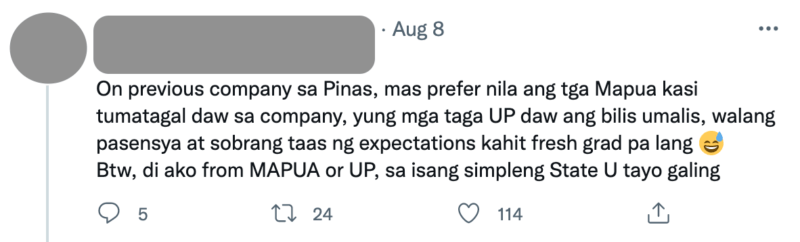 One hiring manager who graduated from UP confessed she preferred hiring graduates from Polytechnic University of the Philippines (PUP) and other non-Big 4 universities. “‘Pag galing sa UP, Ateneo, DLSU o UST, nirerealalk ko agad sa interviews: How long do you think are you gonna stay here?”