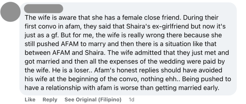 “The wife is aware that she has a female close friend. During their first convo in AFAM, they said that [The Best Friend is an] ex-girlfriend but now it’s just as a [best friend]. But for me, the wife is really wrong there because she still pushed AFAM to marry,” read one comment on Facebook.