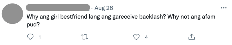 “Why ang girl bestfriend lang ang nag-receive backlash? Why not ang afam pud?” questioned one netizen.