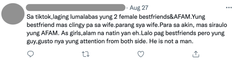 “Para sa akin, mas siraulo yung AFAM. As girls, alam na natin yan eh. Lalo pag bestfriends pero yung guy, gusto nya yung attention from both side. He is not a man,” added another.