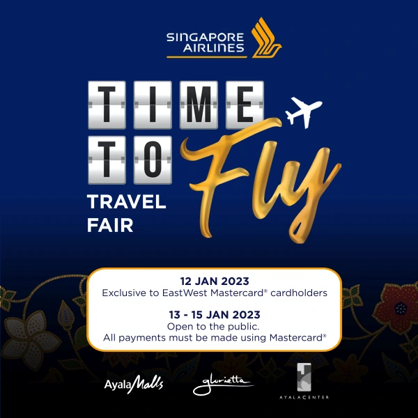The Singapore Airlines Time to Fly Travel Fair will be held at the Glorietta 2 Palm Drive Activity Center. 12 January 2023 is exclusive to EastWest Mastercard cardholders, Singapore Airlines PPS Club members, and Globe Platinum Subscribers; 13 – 15 January 2023 is open to the public. All payments must be made using Mastercard®. For more information about Singapore Airlines Time to Fly Travel Fair, please visit this page.