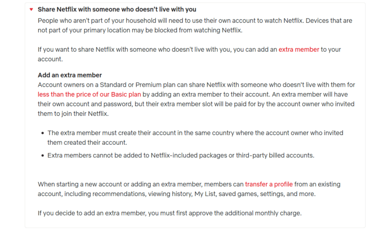 “Account owners on a Standard or Premium plan can share Netflix with someone who doesn’t live with them for less than the price of our Basic plan by adding an extra member to their account. An extra member will have their own account and password, but their extra member slot will be paid for by the account owner who invited them to join their Netflix,” stated the guidelines.
